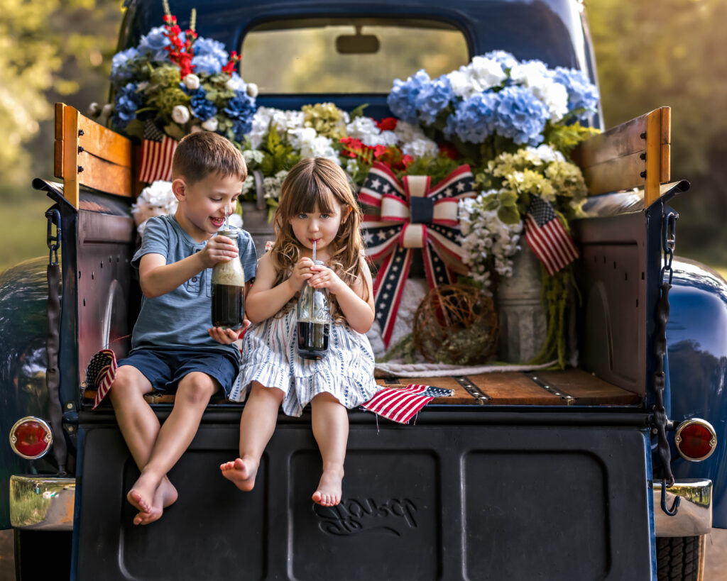 Create a classic Americana family portrait or one of just the kids. Hop in the back of my classic little blue truck in honor of America’s 250th Birthday